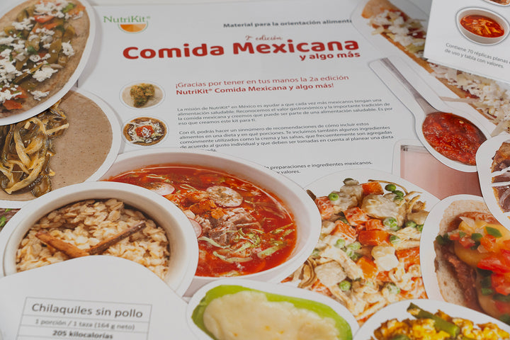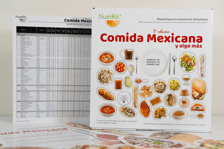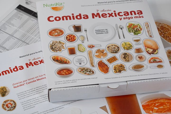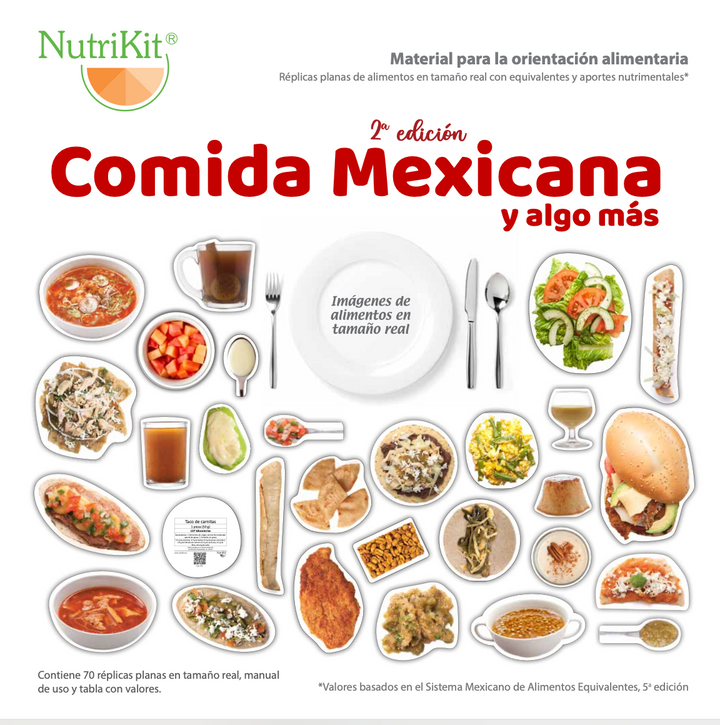 Las réplicas de alimentos de NutriKit® son imágenes a tamaño real de alimentos y bebidas, impresas en cartulina plastificada de alta calidad. Al reverso de cada una se encuentra su información nutrimental y los equivalentes según el Sistema Mexicano de Alimentos Equivalentes (5ª ed.), lo que las convierte en una herramienta educativa indispensable en consulta, talleres, clases o sesiones grupales.